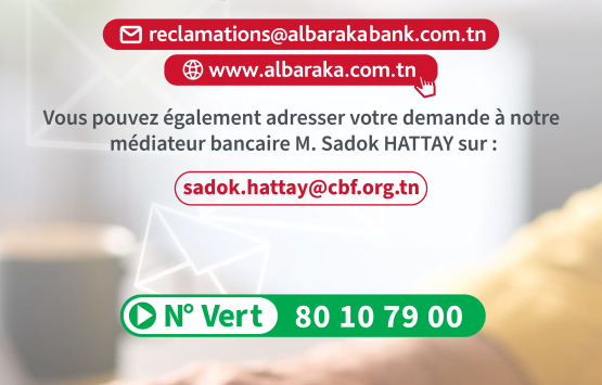 N’hésitez pas à nous contacter via : reclamations@albarakabank.com.tn
